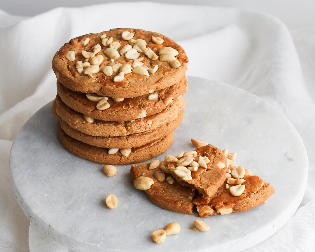 Robuuste, knapperige roomboterkoeken met een topping van pinda’s.