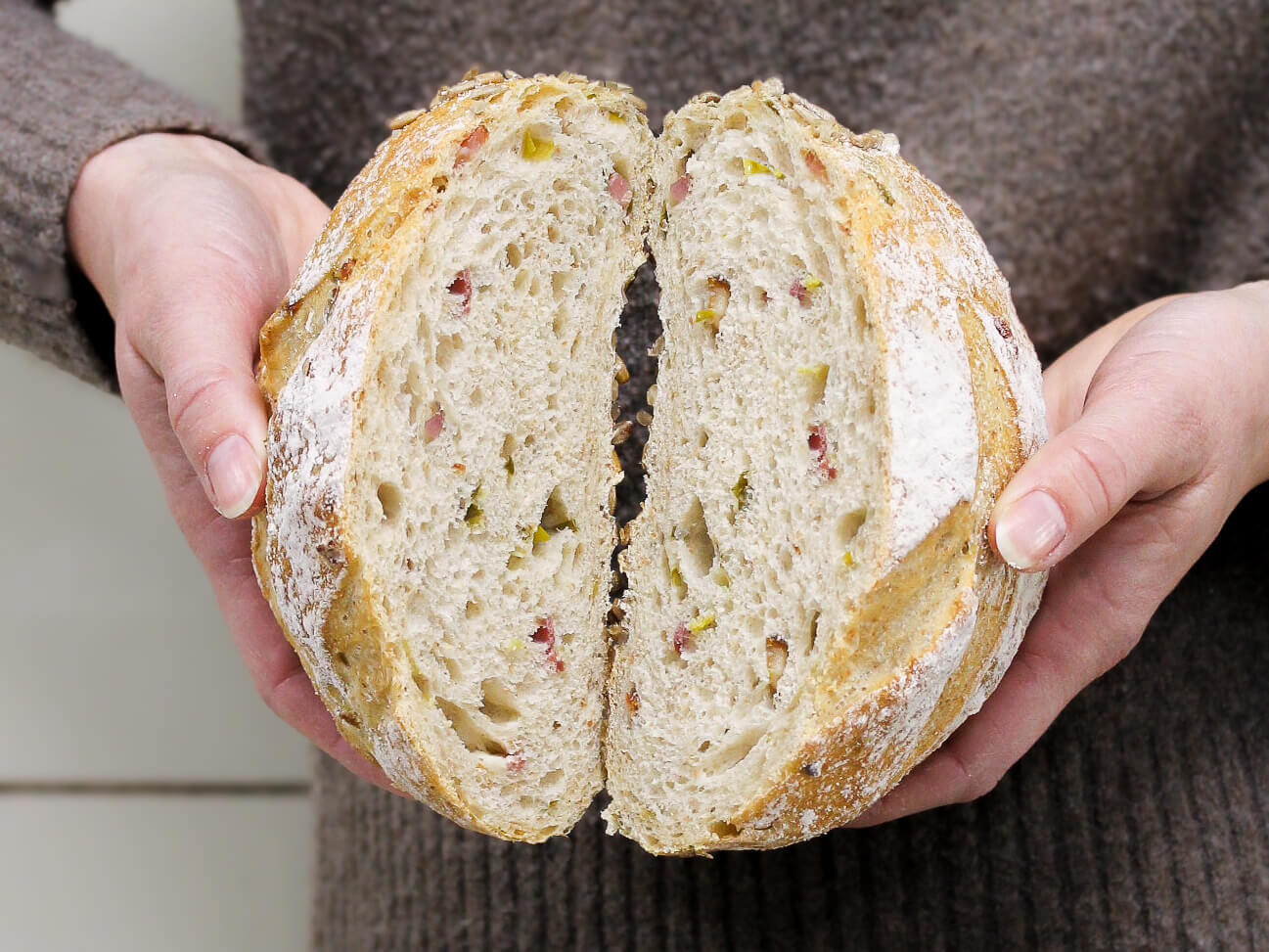 Luchtig wit desembrood gevuld met lente-ui en spekjes.
