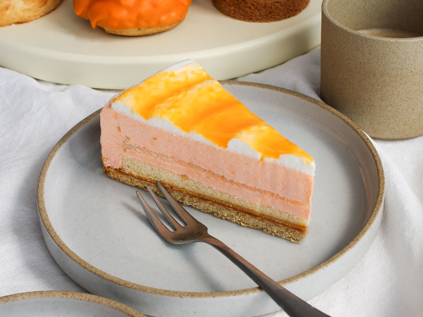 Luchtige gebakspunt met een koekbodem, laagjes cake en sinaasappelbavaroise op basis van kwark.